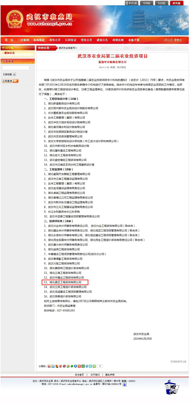 我公司入選武漢市農(nóng)業(yè)局第二屆農(nóng)業(yè)投資項目中介機構(gòu)庫