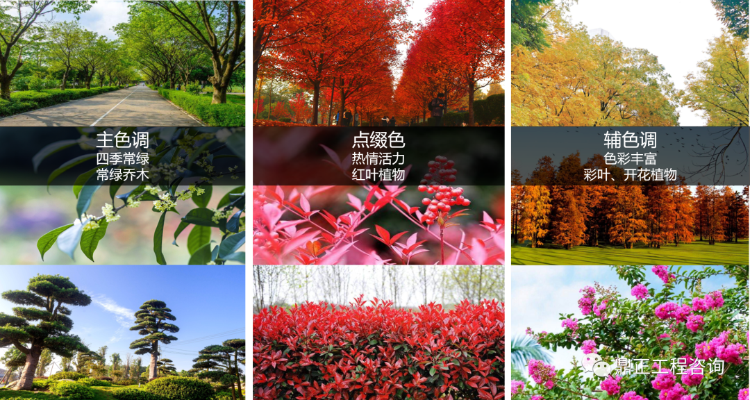 “生態園區,四季有花,處處皆景”——以常綠植物襯底,紅色植物點睛,色葉交融。