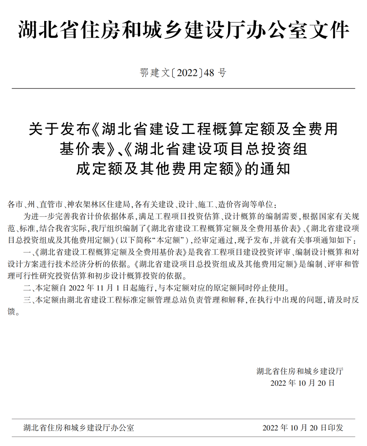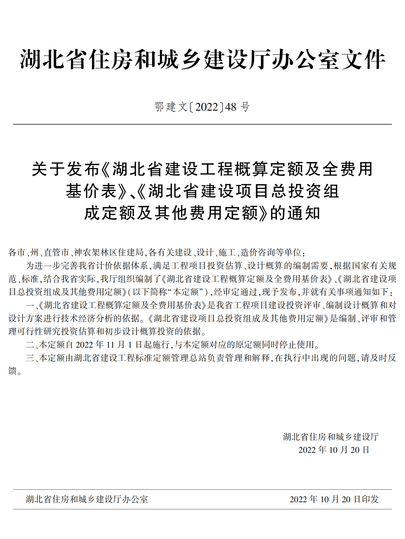 為進一步完善我省計價依據體系,滿足工程項目投資估算、設計概算的編制需要,根據國家有關規范、標準,結合我省實際,我廳組織編制了《湖北省建設工程概算定額及全費用基價表》《湖北省建設項目總投資組成及其他費用定額》(以下簡稱“本定額”),經審定通過,現予發布,并就有關事項通知如下: