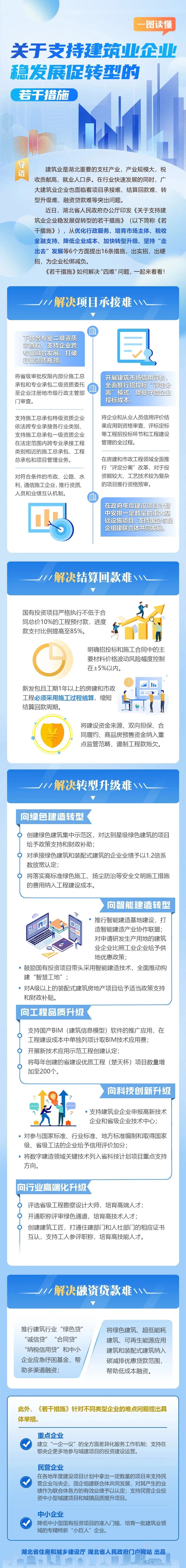 近日,湖北省人民政府辦公廳印發(fā)《關(guān)于支持建筑業(yè)企業(yè)穩(wěn)發(fā)展促轉(zhuǎn)型的若干措施》(以下簡稱《若干措施》),從優(yōu)化行政服務(wù)、培育市場主體、稅收金融支持、降低企業(yè)成本、加快轉(zhuǎn)型升級、堅持“走出去”發(fā)展等6個方面提出16條措施,出實招、出硬招,為企業(yè)松綁減負。