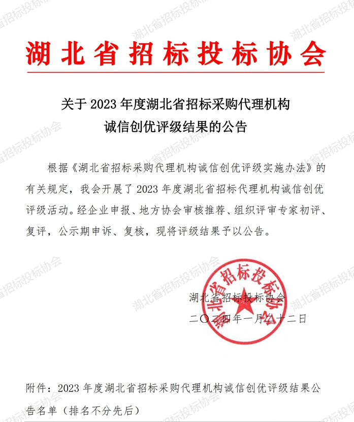近日,鼎正憑借誠信的經(jīng)營理念、良好的企業(yè)信譽(yù)和優(yōu)質(zhì)的服務(wù)質(zhì)量,榮獲由湖北省招標(biāo)投標(biāo)協(xié)會認(rèn)定的最高等級“招標(biāo)采購代理機(jī)構(gòu)信用評價(jià)AAA級信用企業(yè)”稱號。