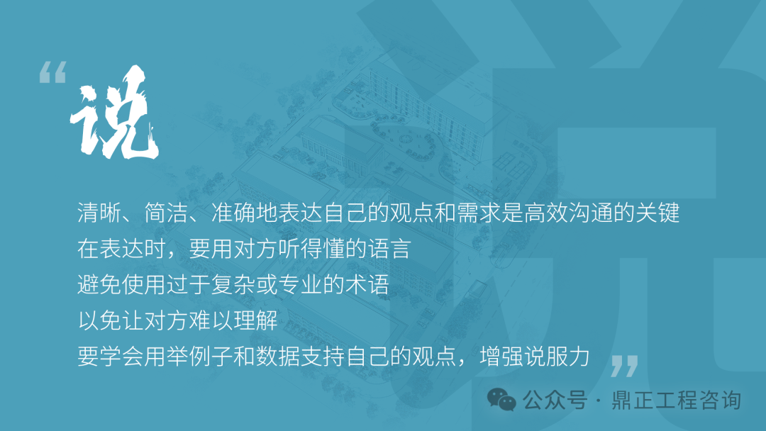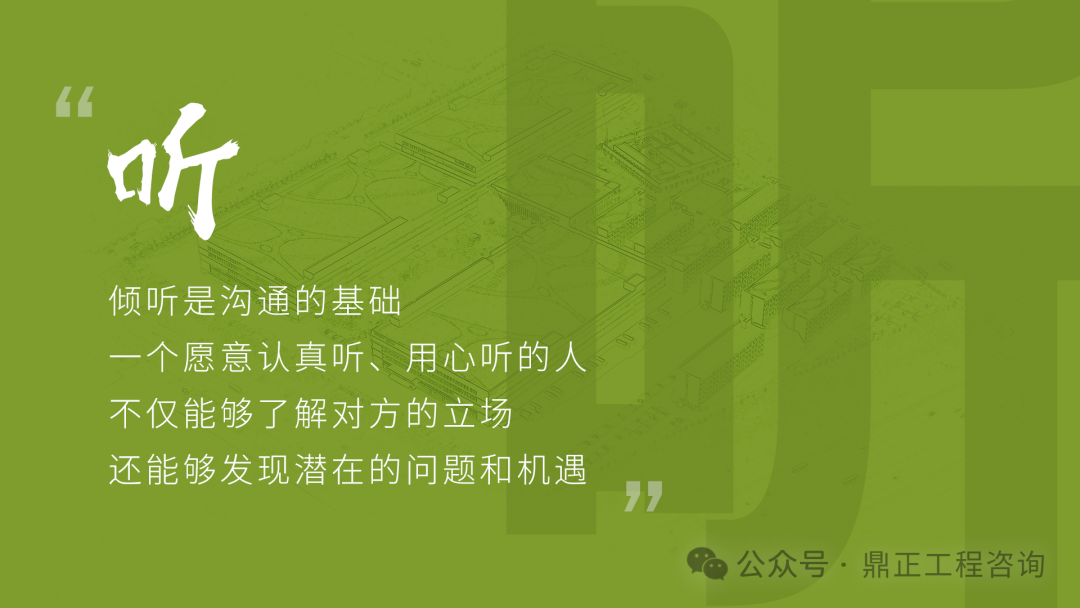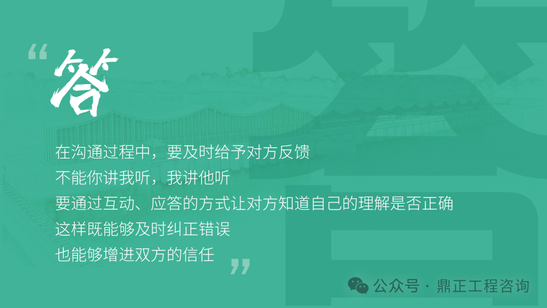 交流要看對象,不能對牛彈琴。與農(nóng)民工交流要用農(nóng)民工聽得懂的語言;與同行或其他咨詢機(jī)構(gòu)交流要用專業(yè)語言;與直接上級交流要及時反饋并提出合理建議;與客戶交流,要從客戶的視角出發(fā),為其提供最優(yōu)解決方案。